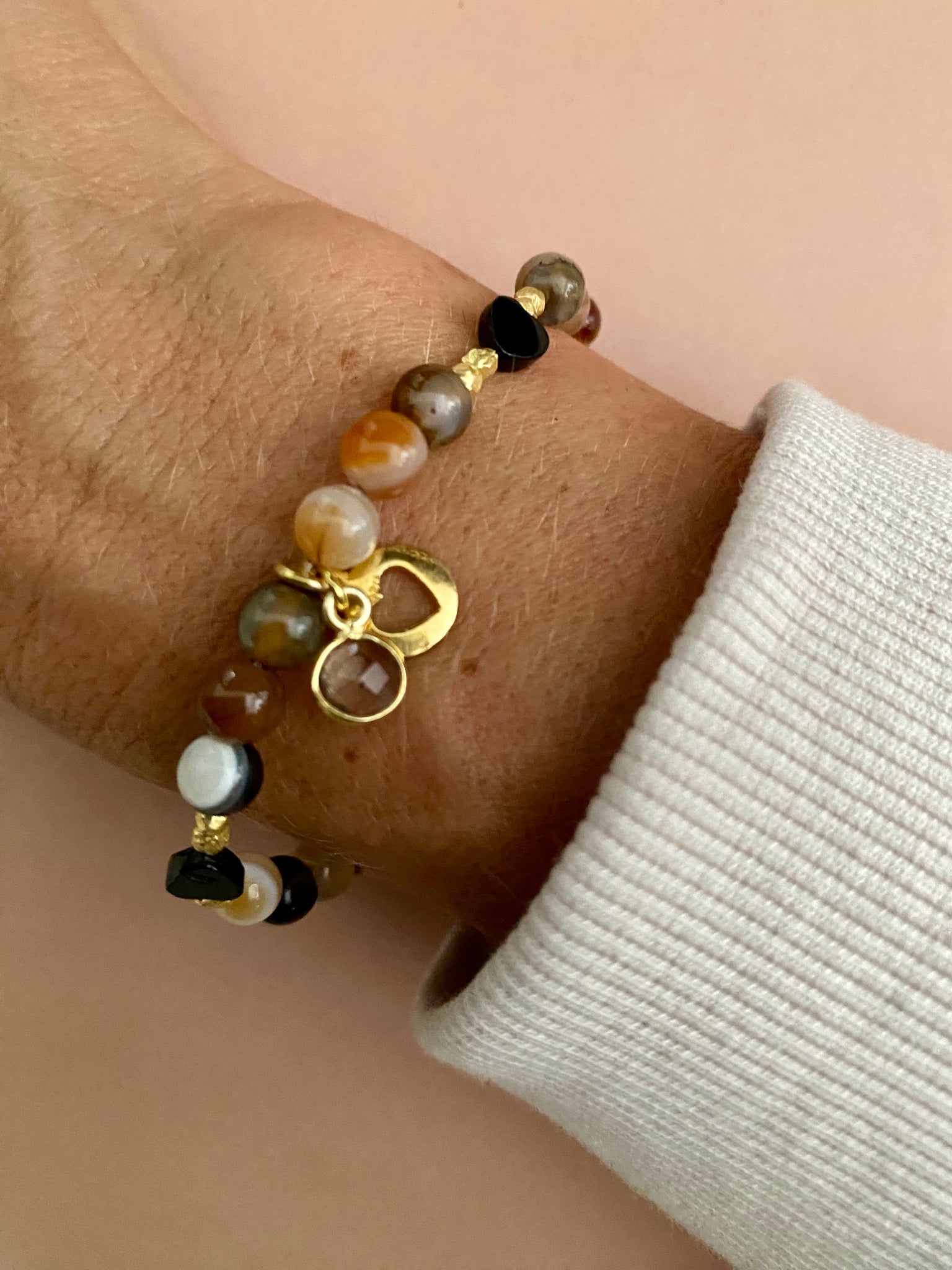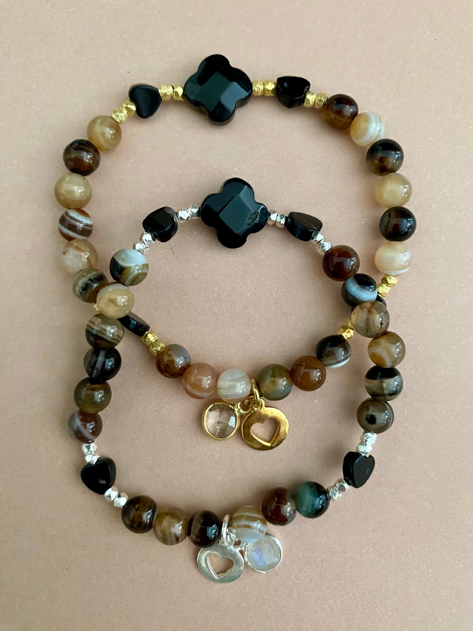 Turmalinherzen, facettierter Onyx, Achat in den schönsten Naturtönen, sowie ein Herz Amulett und ein facettierter und gefasster Edelstein zieren unsere Brownie Armbänder.