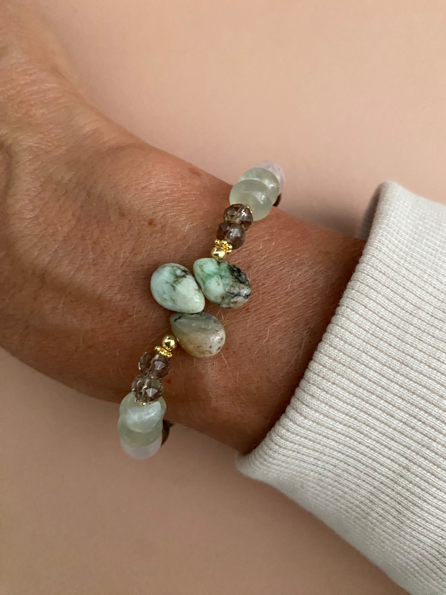 Facettierter Rauchquarz, Chrysopas Tropfen, Achatperlen und Jade Scheiben, interessant kombiniert durch Glitzer, durchscheinend oder opaque Optik machen hier einen coolen Look.