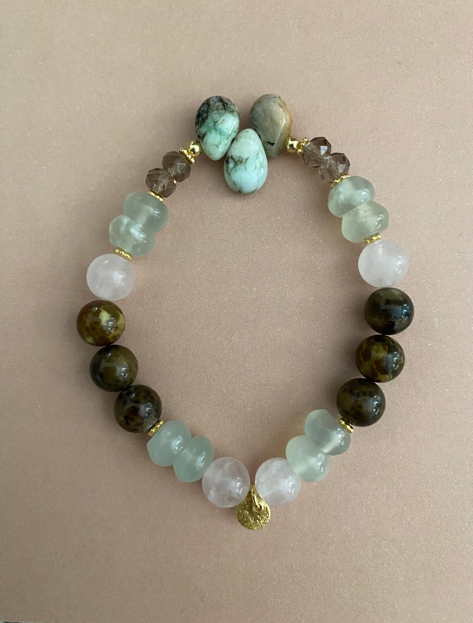 Die Cozy Armbänder, aus zarten Braun, Grün und Rosa Farbtönen, kombiniert mit Sterling Silber Elementen bzw. vergoldeten Sterling Silber Elementen und einer Länge von 17,5 cm. Auf elastisches Band gearbeitet, passt sich Cozy zu vielen Farben und Kombinationen wunderbar an.