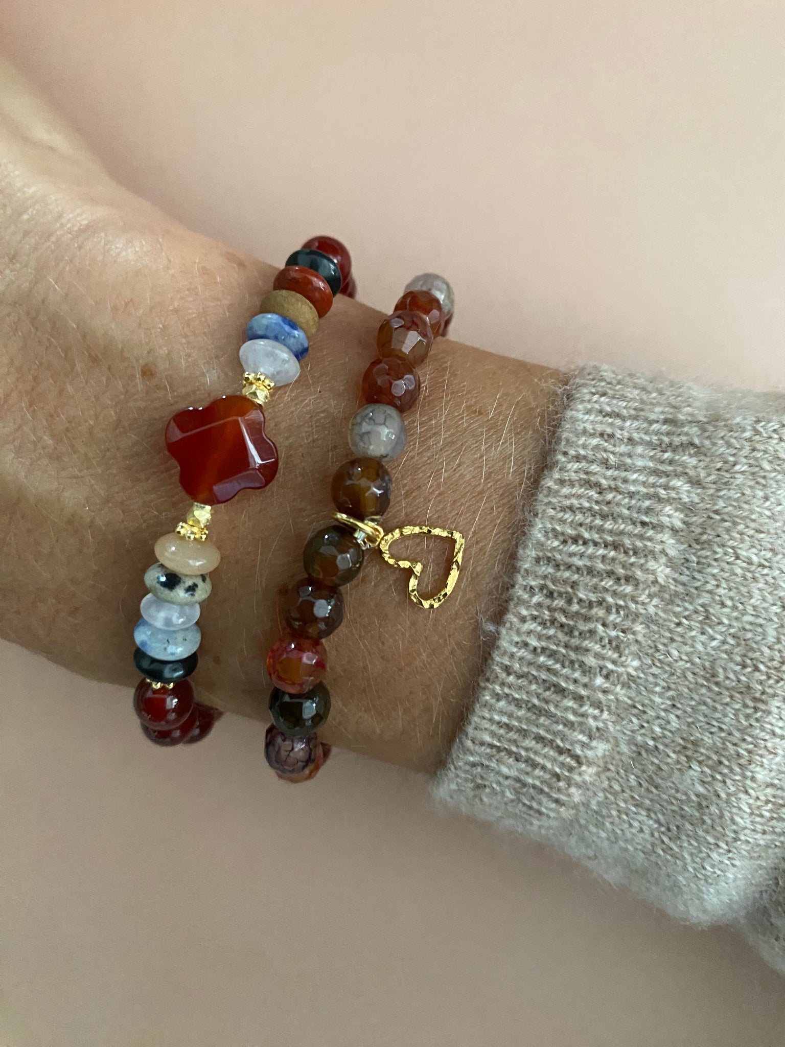 Carneol, facettierter Achat und diverse Edelstein Rondelle mit einem zierlichen Herz Anhänger vereinen hier viele schönen herbstlichen Farben. Mit einer Länge von17,5 cm ist Goofy auf elastisches Band gearbeitet.