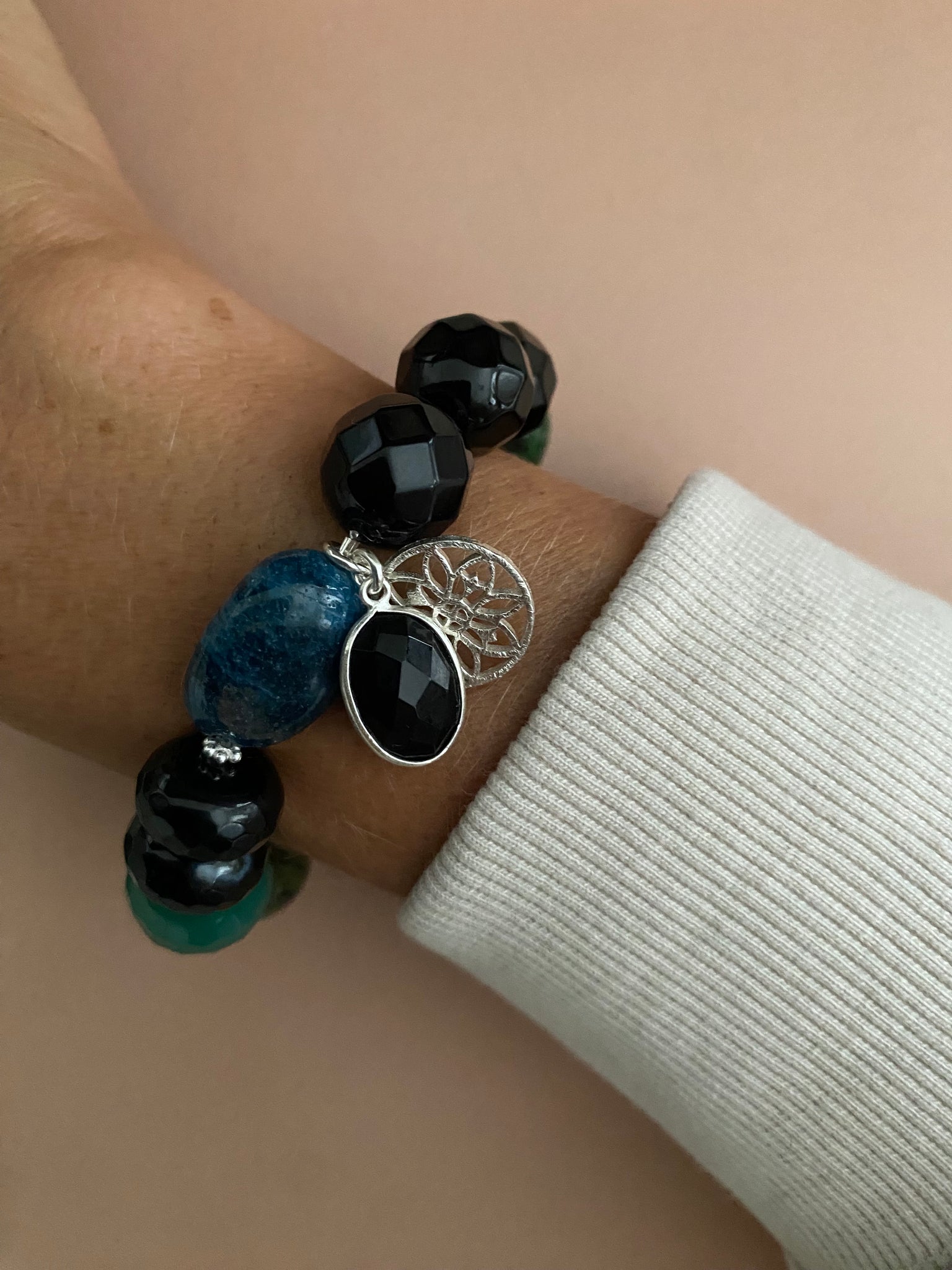 Edelsteine wie Onyx Achat und vielen mehr, mit Mandala und gefasstem facettierten Onyx Anhänger geben hier einen coolen und edlen Look.