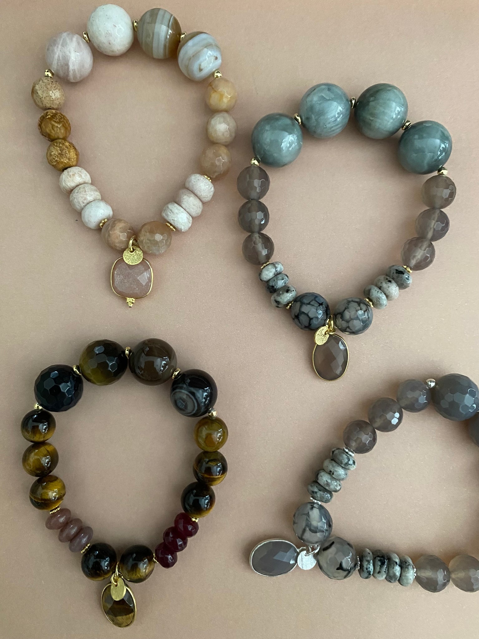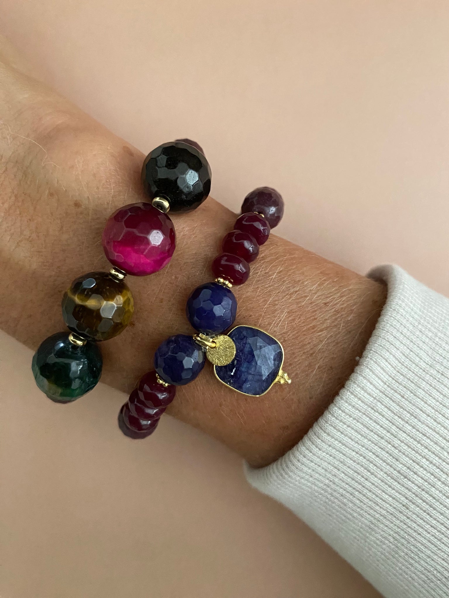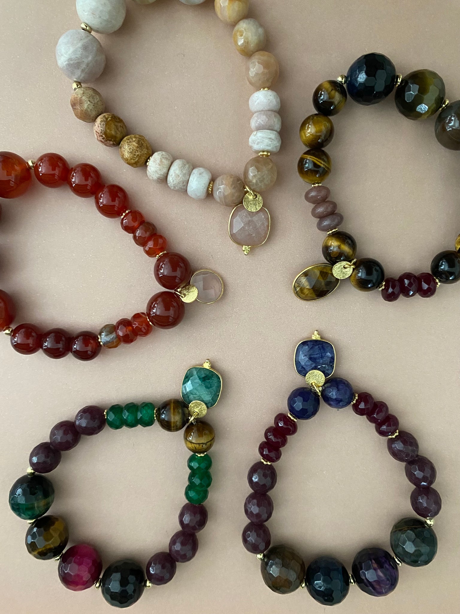 Gefasste und facettierte Edelsteine zieren eine Seite der Armbänder. Sie lassen sich super kombinieren und sind ein edler Hingucker.