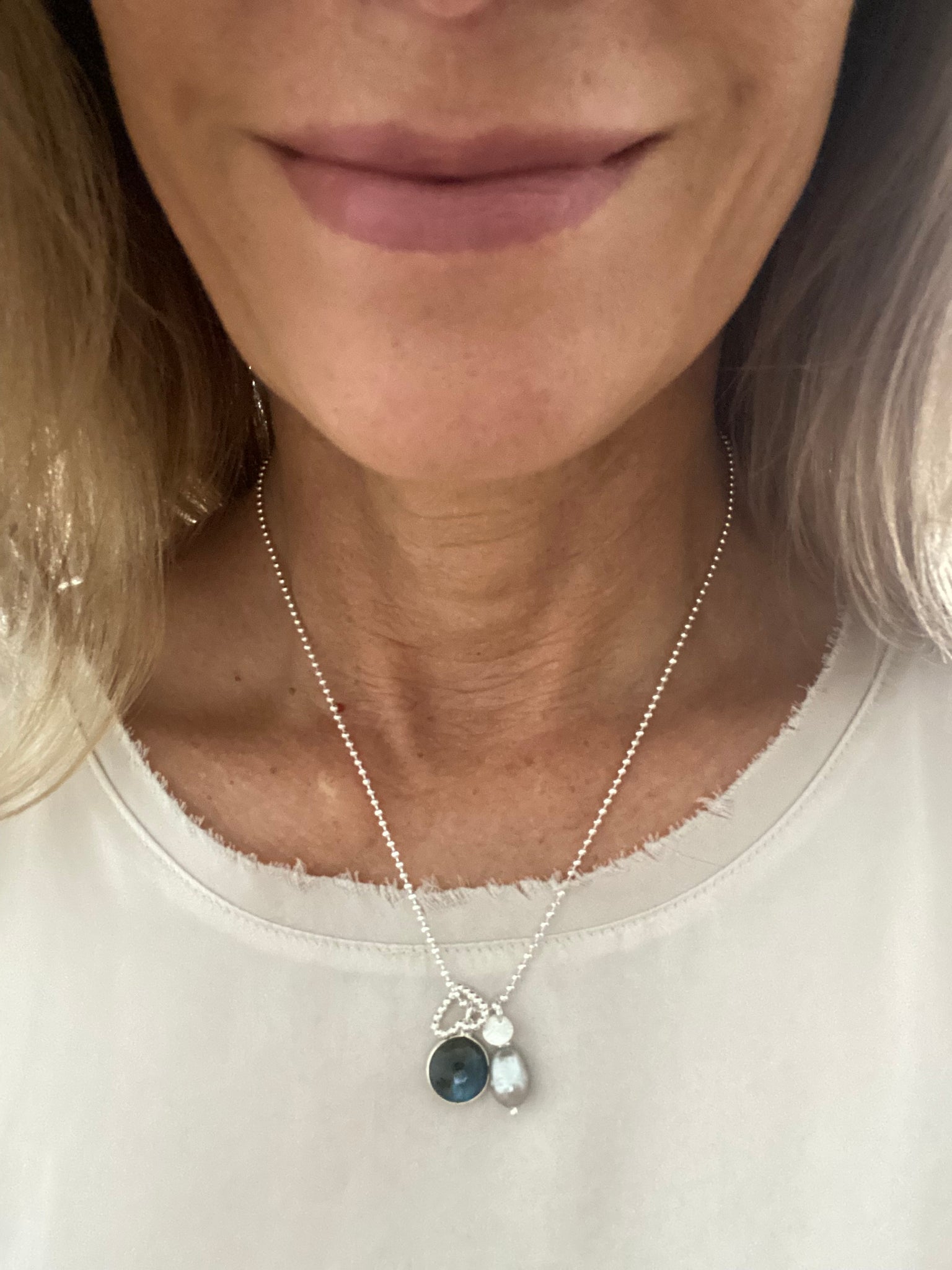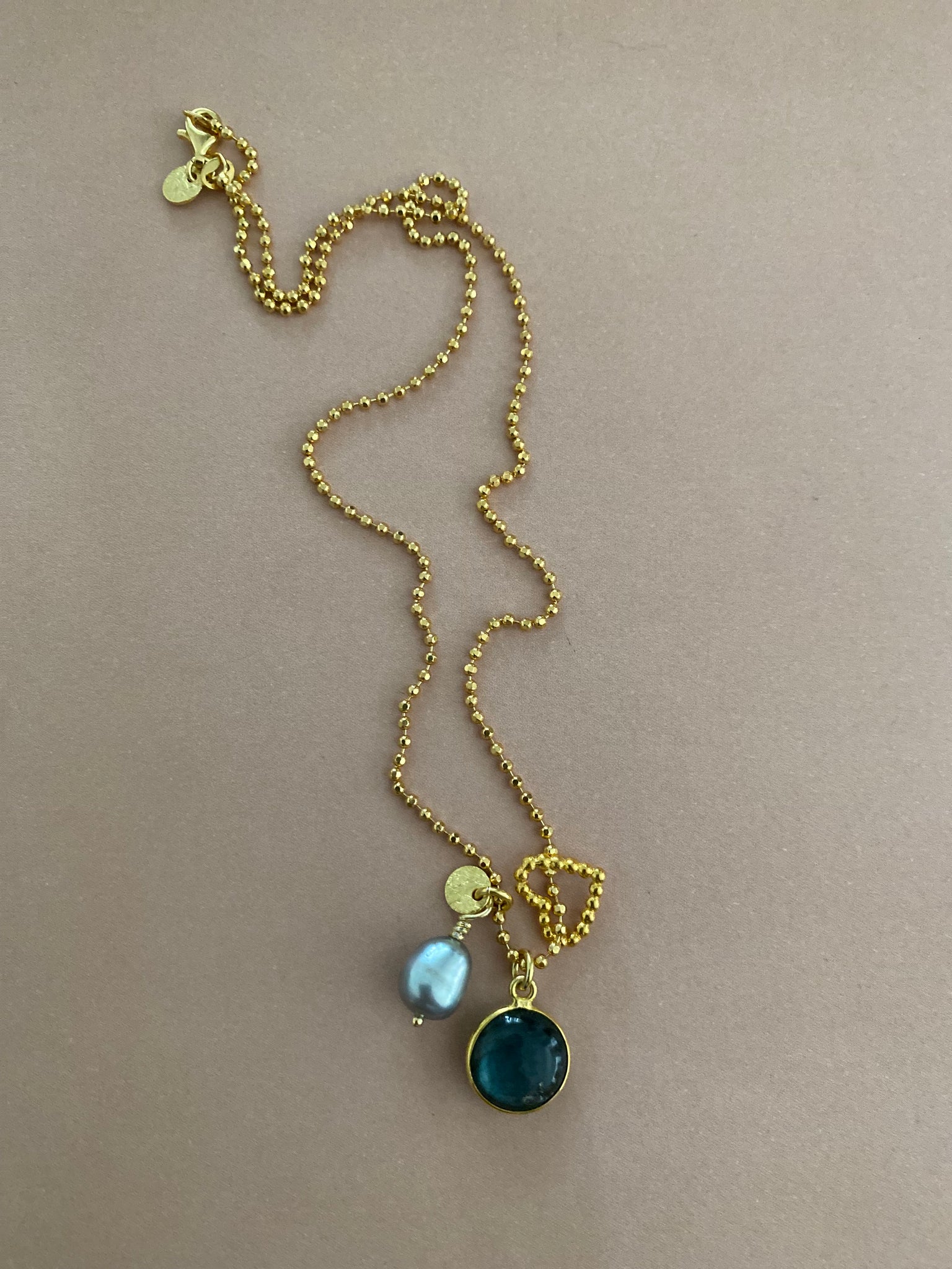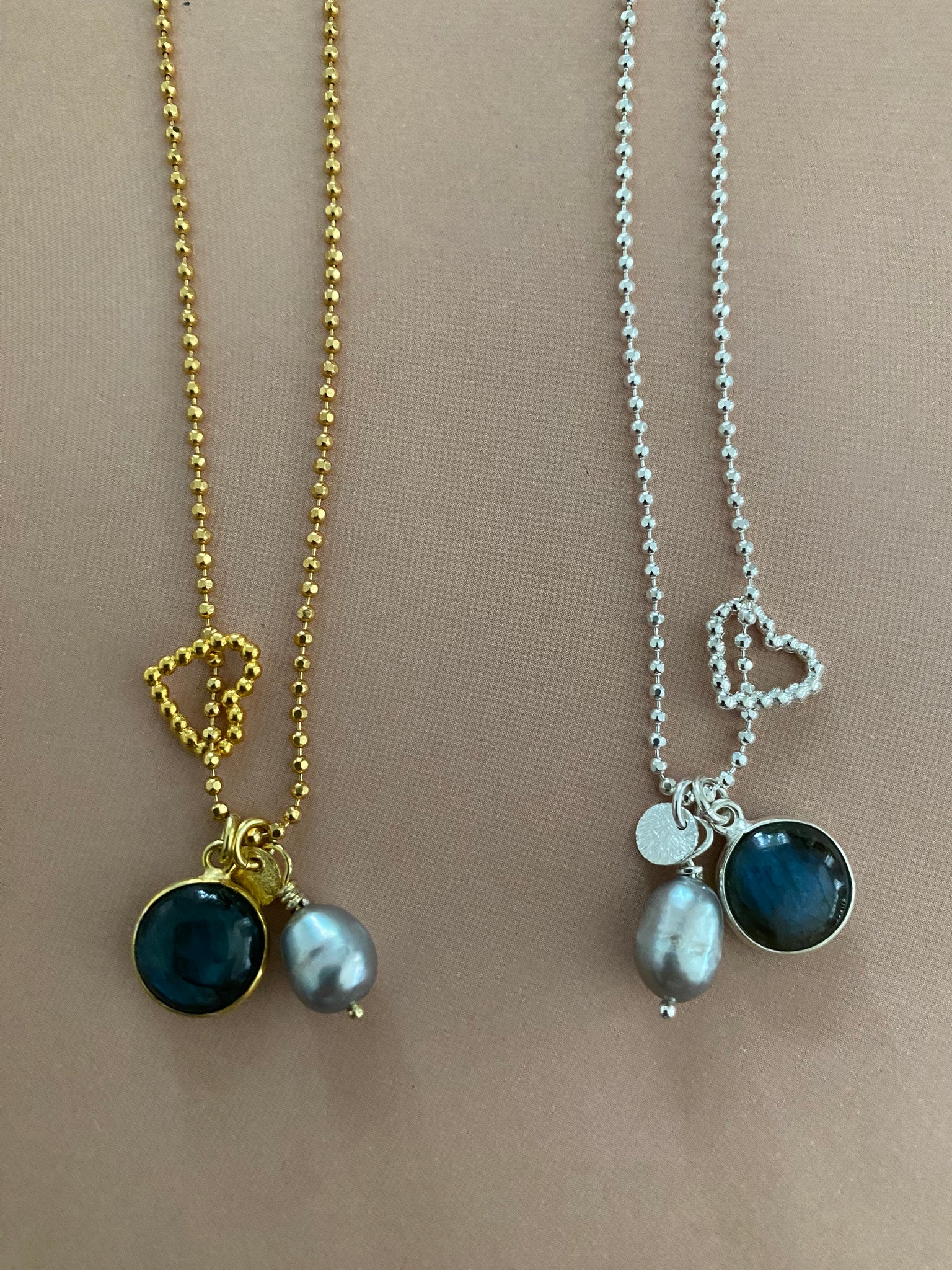 Diamantierte und facettierte Halsketten aus (vergoldetem) Sterling Silber von 45 cm Länge mit drei verschiedenen Anhängern: einer grauen Süßwasserperle, einem gefassten bauchig geschliffenen Labradorit und einem Herzen in Kugelketten Art. Die drei Anhänger bewegen sich mit Ihnen und haben dadurch ein interessantes Eigenleben.